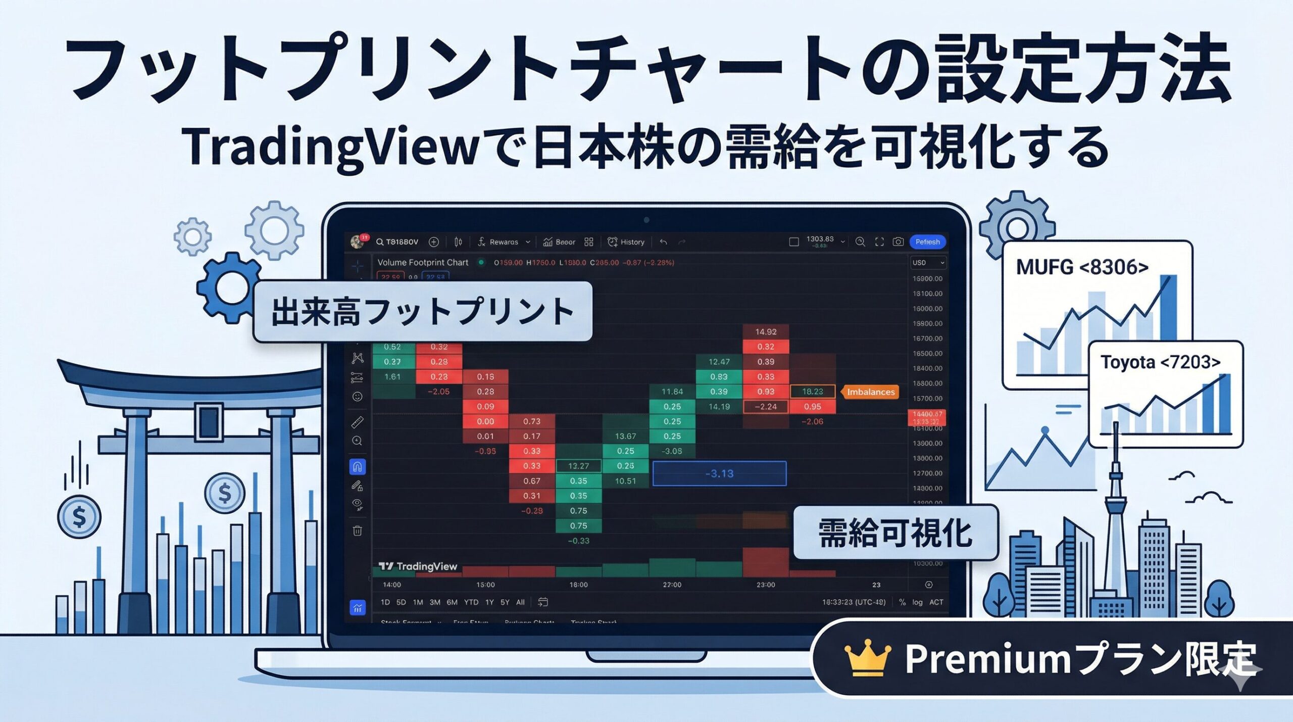 この記事では、TradingViewでフットプリントチャートを表示する手順から、日本株スイングで使うときの推奨設定まで、一つずつ進めていく。