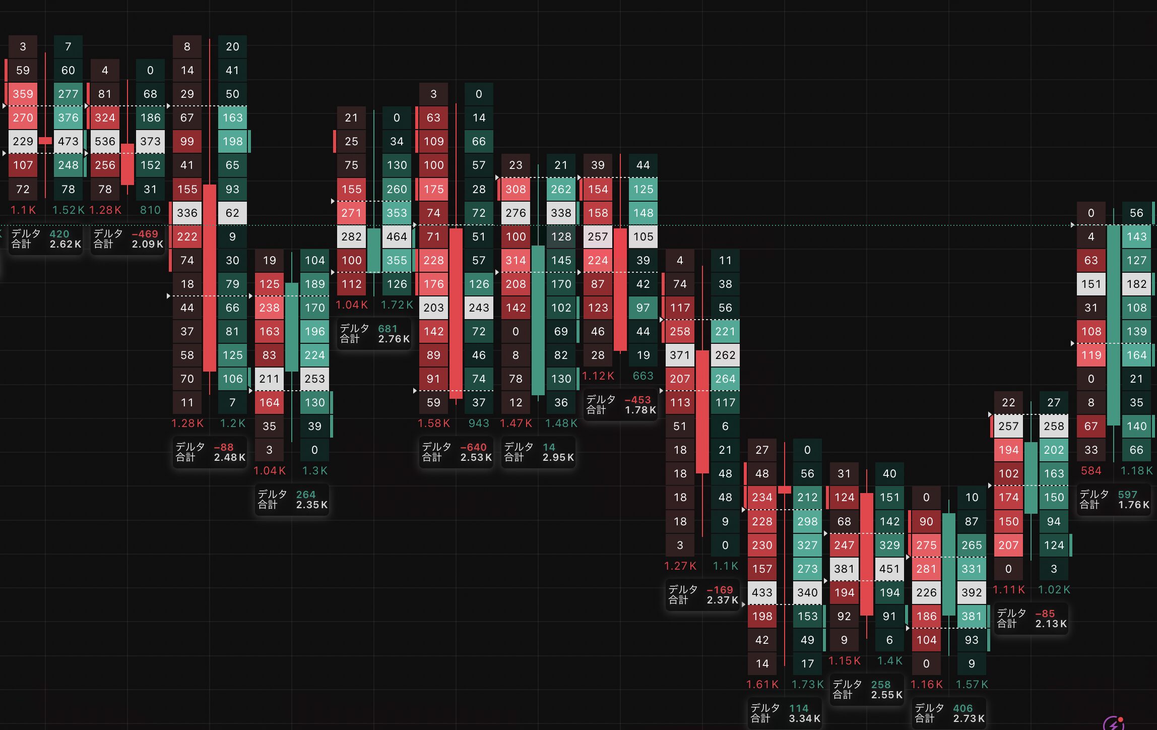 たとえば、ある価格帯で非常に大きなプラスのデルタが出現した場合、そこで大口の買いが入った可能性が高く、今後もその価格帯は強いサポートとして機能しやすくなります。